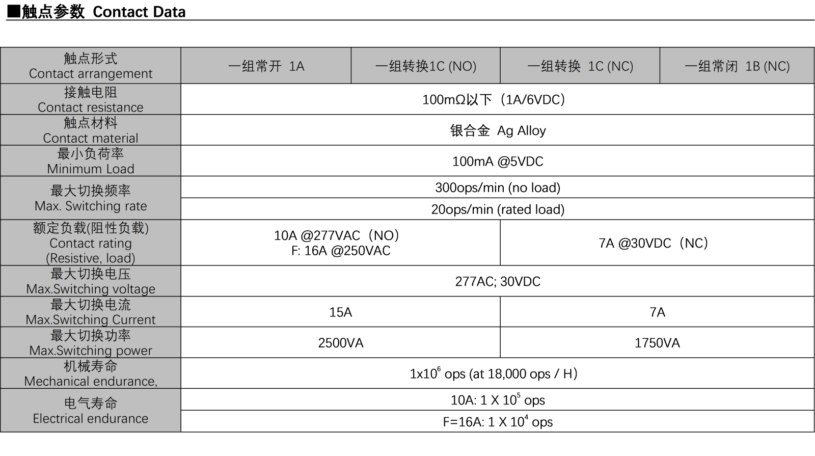 觸點結構 Contact of Arrangement 1A=1FormA常開型; 1B=1FormB常閉型; 1C=1FormC轉換型 | ||||||||